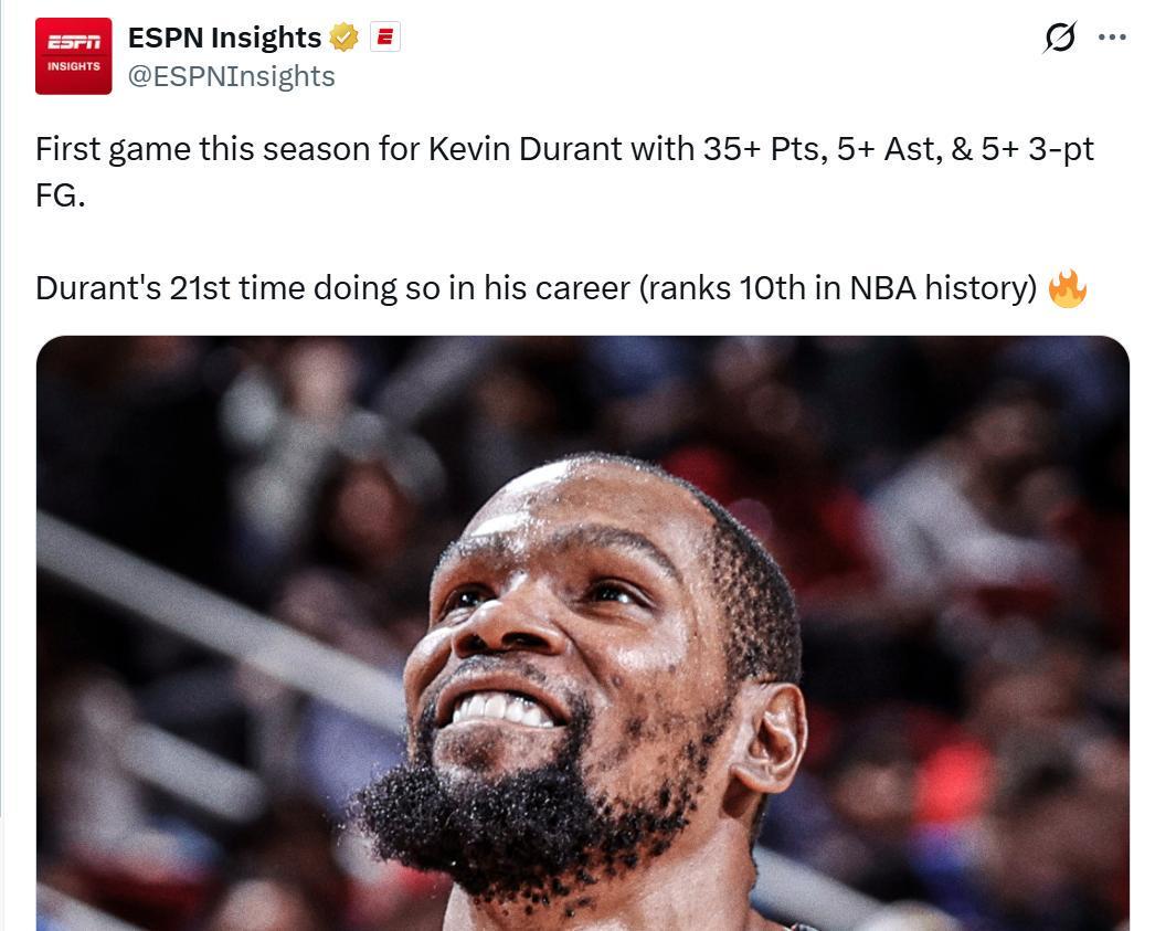 同时本场是杜兰特加盟火箭之后,首次单场拿到至少35+5助攻+5三分,也是其生涯第21次,位列NBA历史第十。