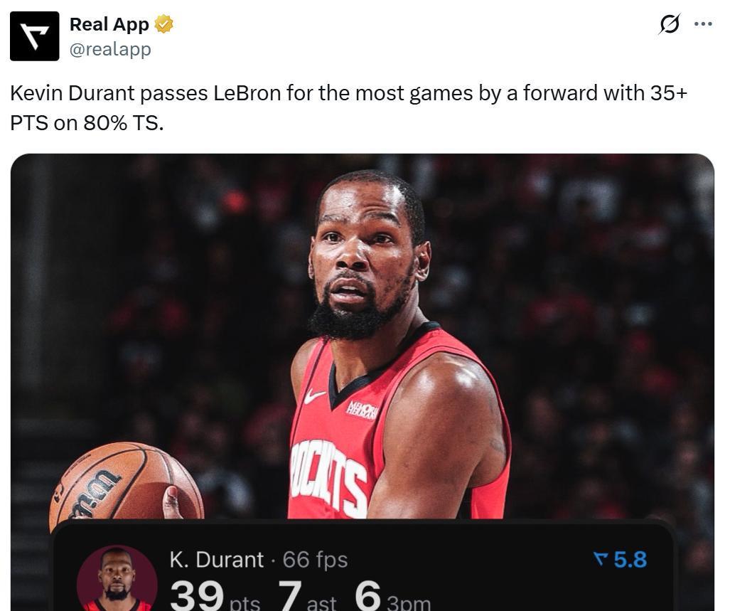 并且这是杜兰特生涯第21次单场至少轰下35分且真实命中率80%+,成功超越詹姆斯(20次)独占NBA锋线历史第一。
