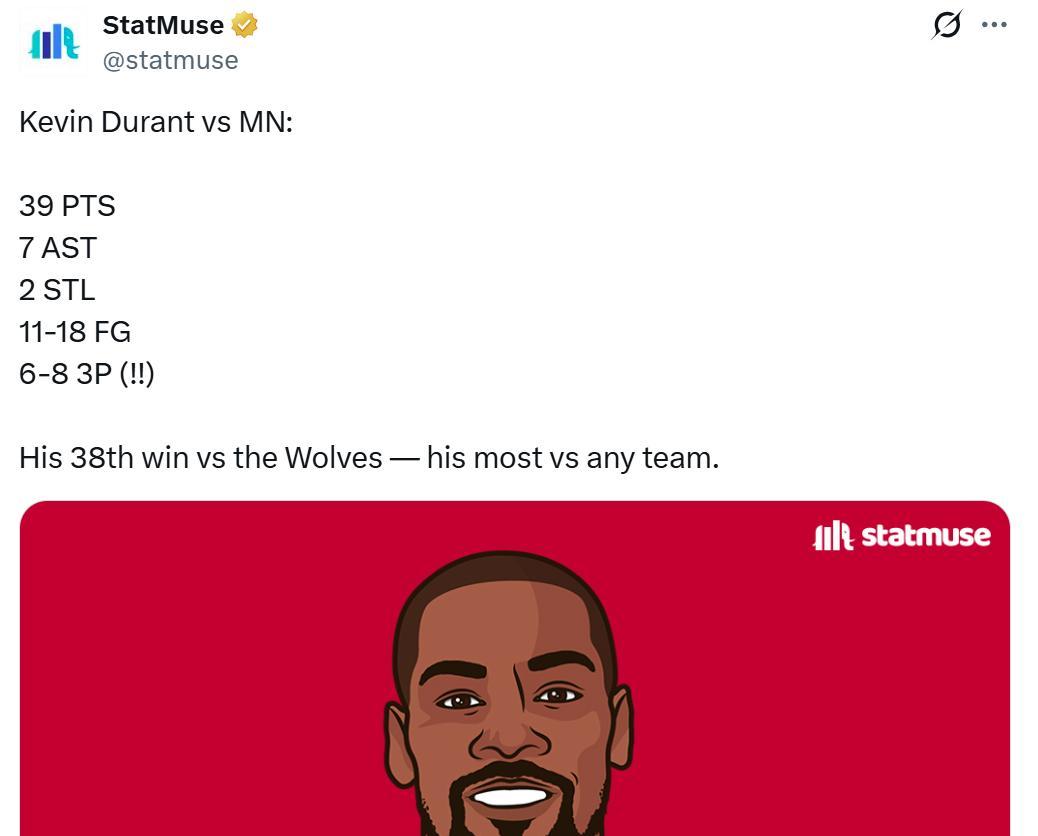 凭借这样的表现,杜兰特生涯至今已经38次击败森林狼,创造其生涯击败球队次数新高。