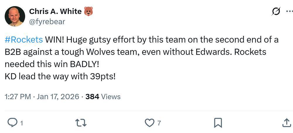 正如赛后火箭媒体人Chris A. White所说:“在背靠背第二战,火箭队击败了强敌森林狼,全队展现出巨大的勇气和拼劲,杜兰特轰下39分,拿下了一场急需的胜利。”